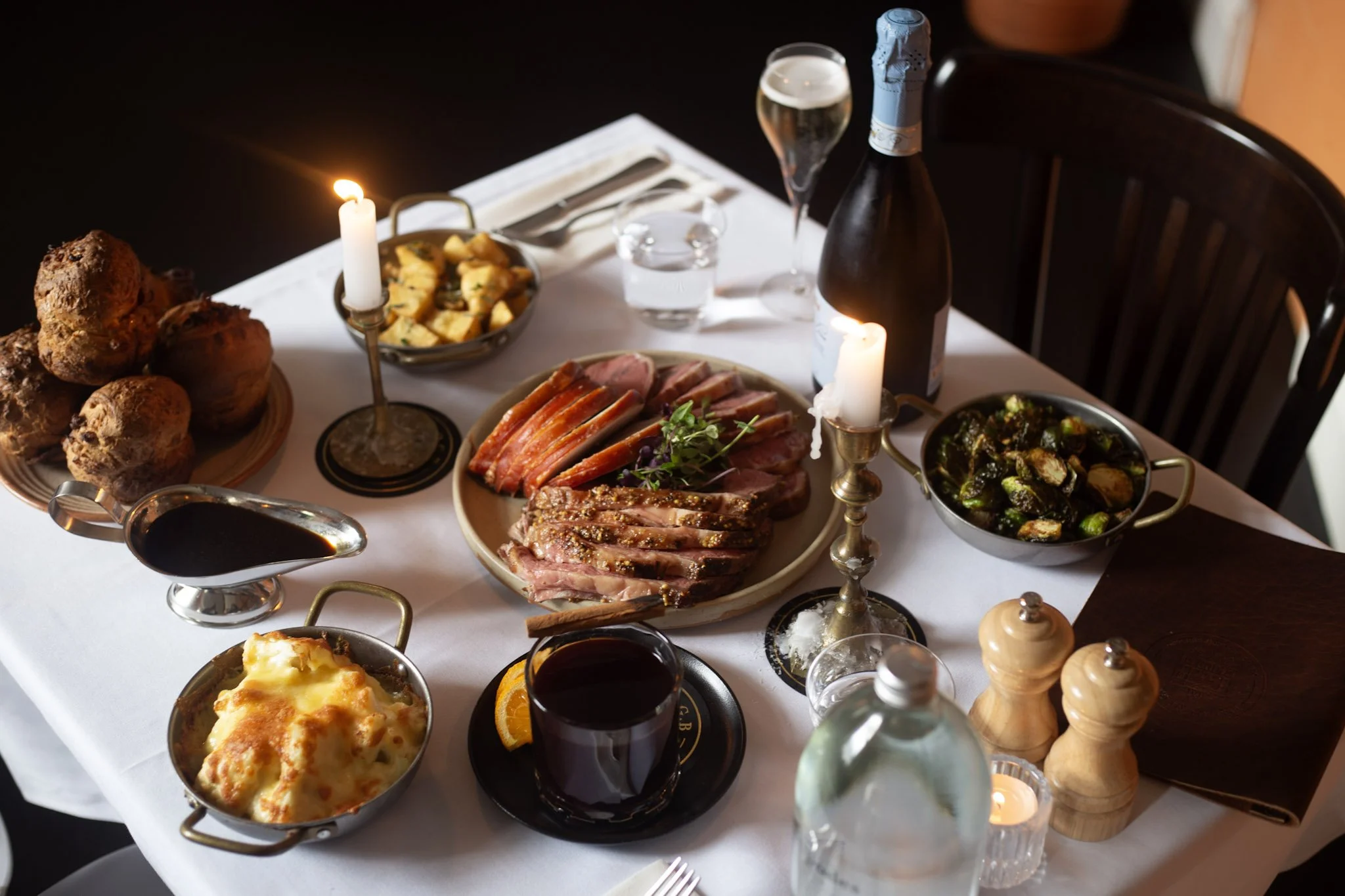 Settle in for a long lunch in our candlelit dining room. Begin with a glass of bubbles or spiced mulled wine on arrival, followed by a delicate amuse-bouche, a beautifully prepared traditional roast, and a decadent dessert to finish.
